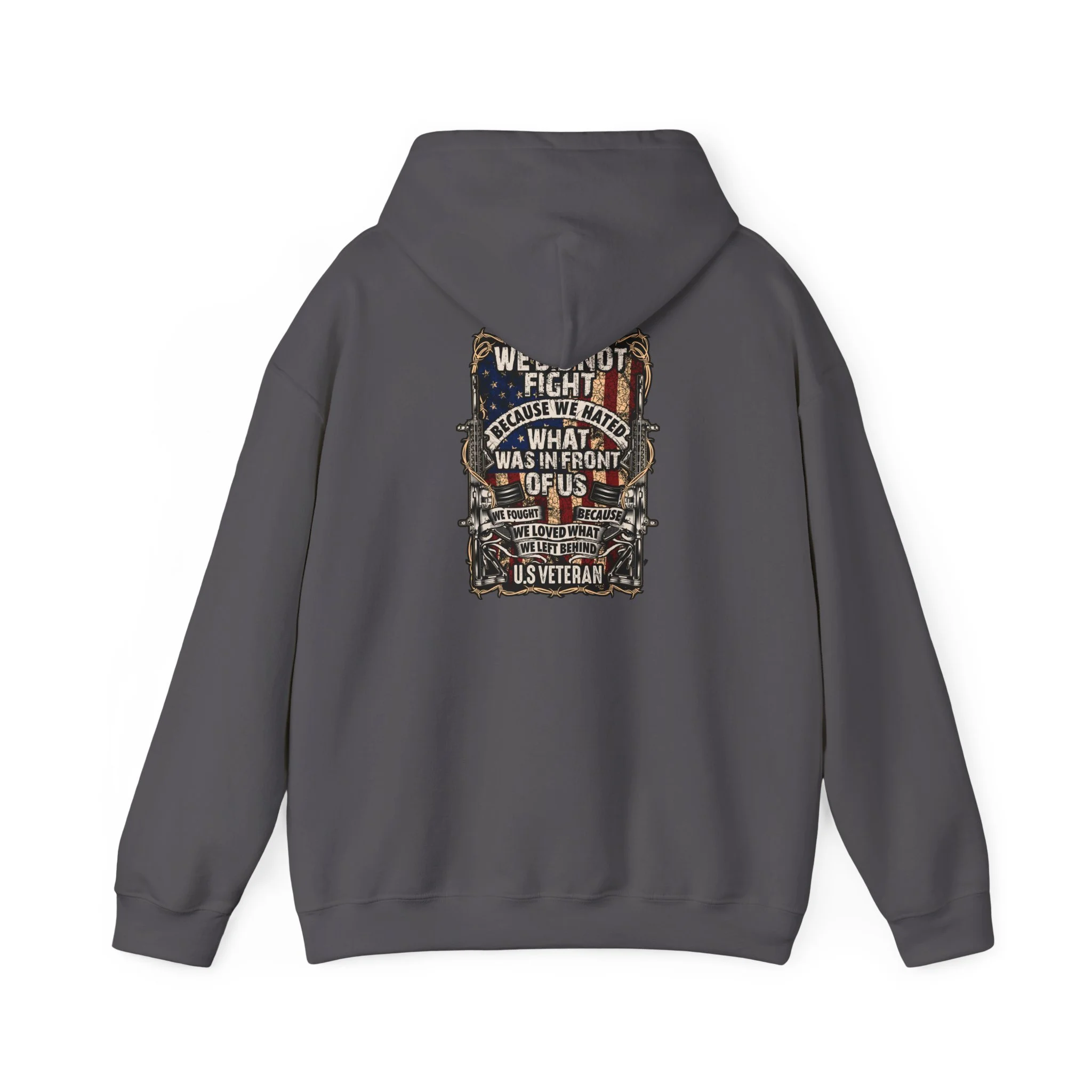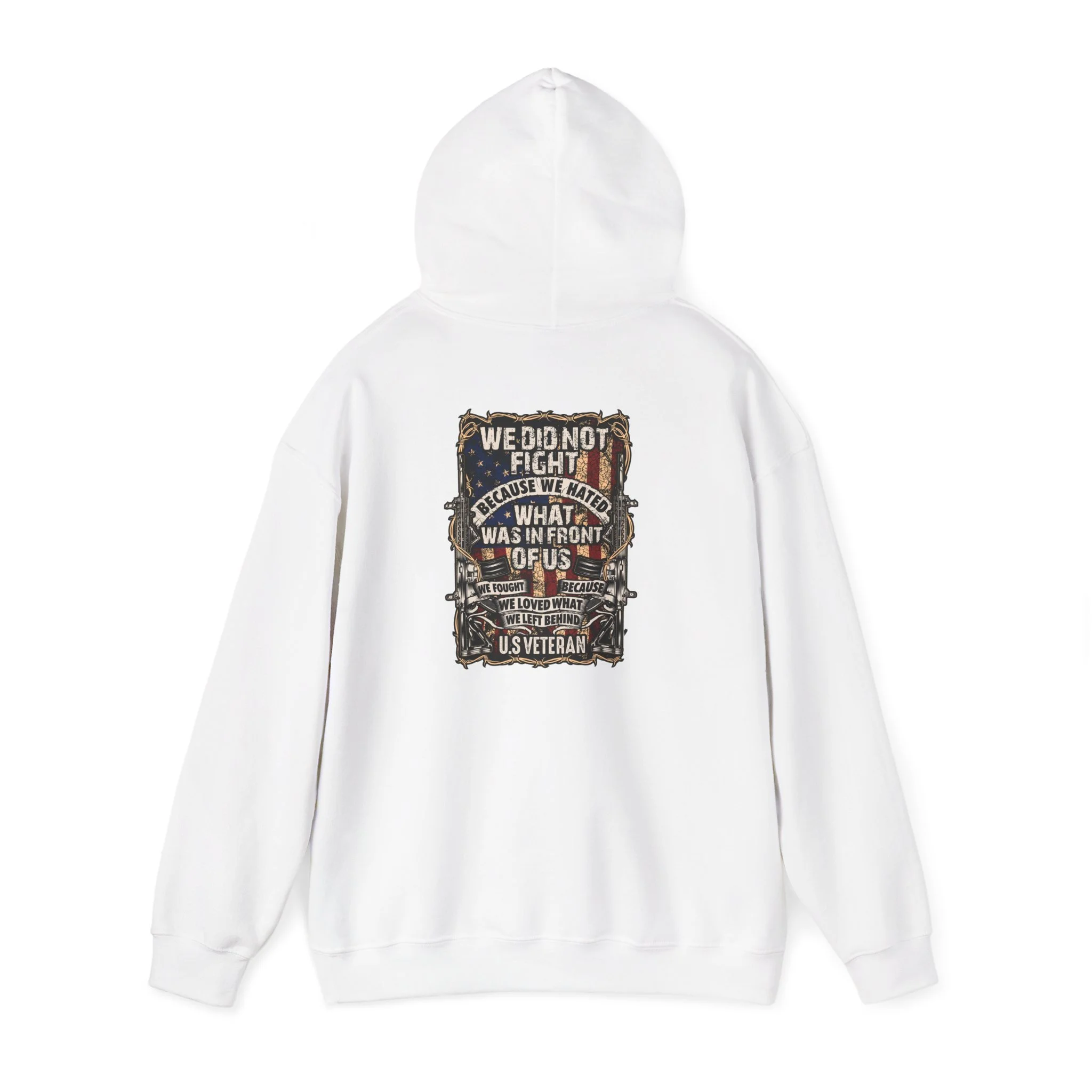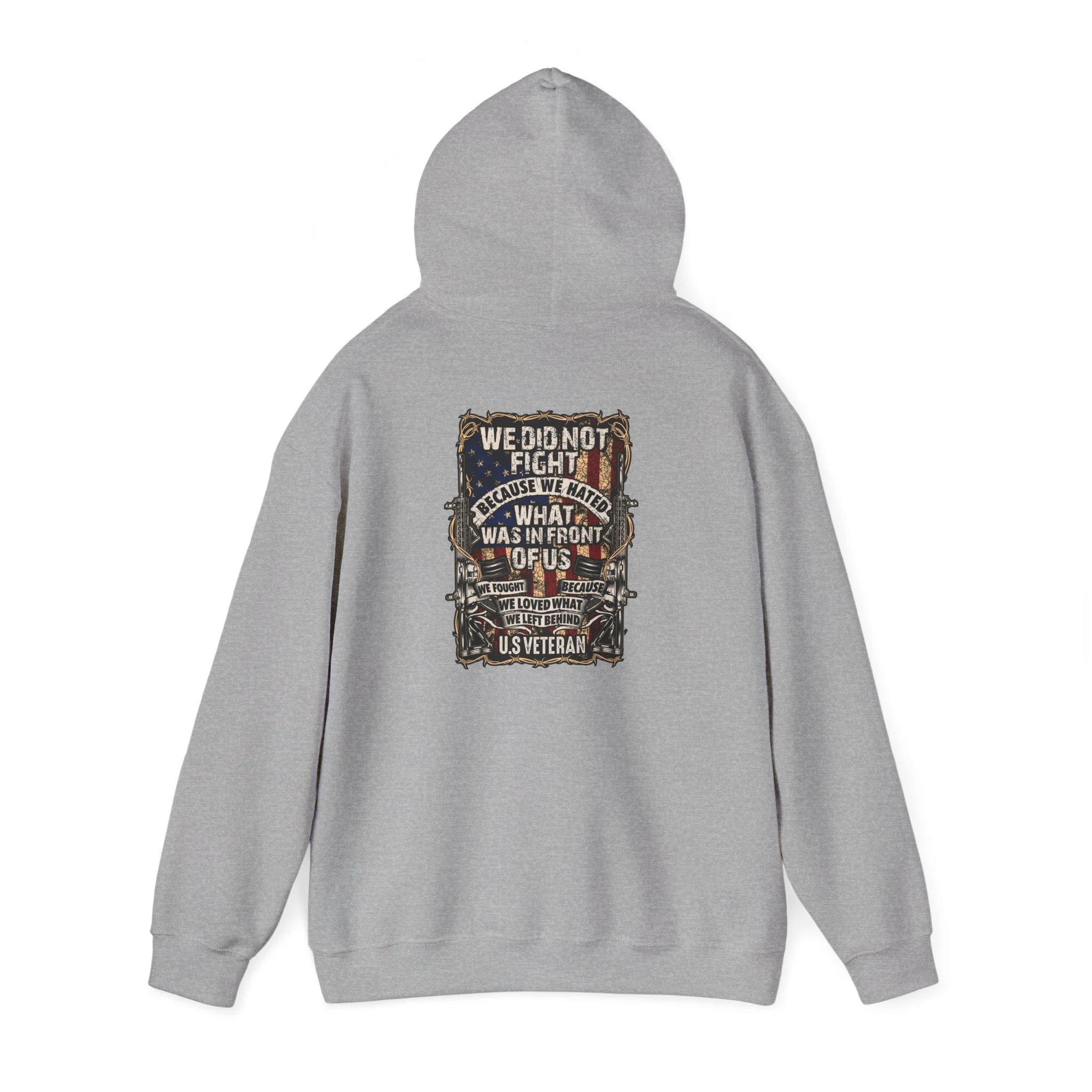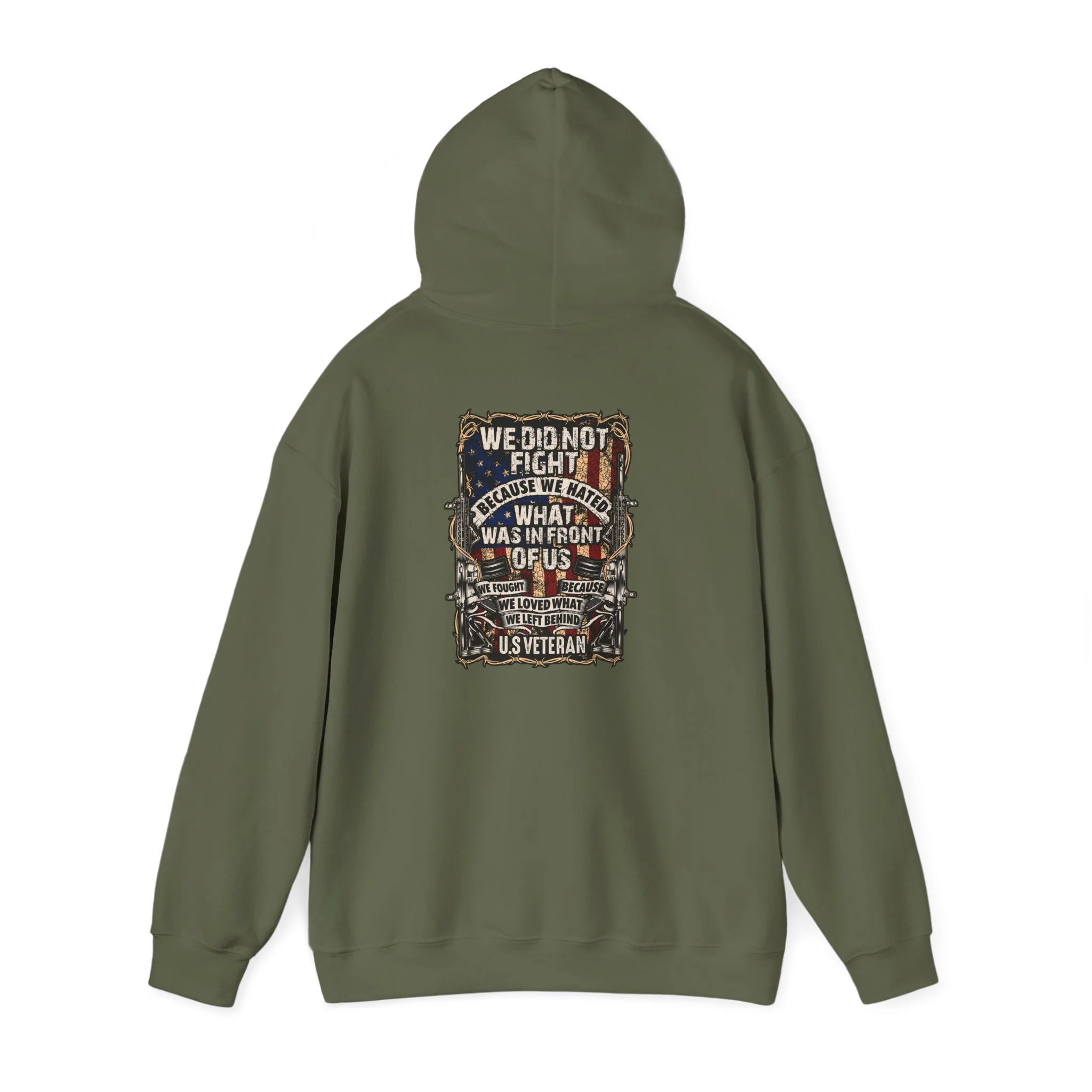 This soft, mid-weight hoodie blends lived-in comfort with bold, rugged design. The roomy kangaroo pocket and double-lined hood shelter you on cool mornings. On the back, a detailed, vintage-inspired graphic—weathered textures, muted earth tones, and layered typography—feels like a worn patch from a long road trip or a veteran’s keepsake. It drapes comfortably with a classic fit and tear-away label so nothing itches while you move. Wear it when you want something that looks storied and true: to commute, to sit by a bonfire, or to carry a memory on your shoulders.